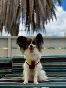 ソファで可愛く笑顔を振りまくコロ