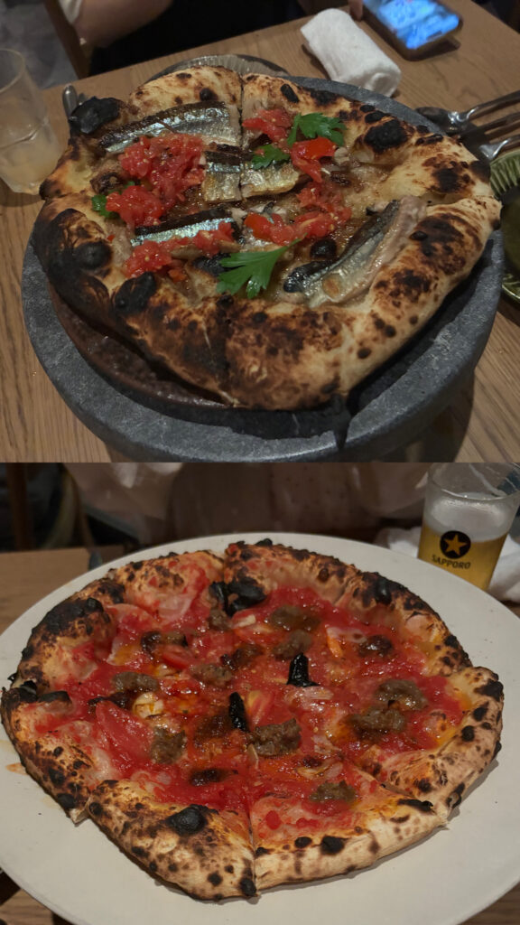 メインのピザは、旬の秋刀魚をのせた迫力満点のピザとラム肉を使ったピリ辛のアラビアータをチョイスしました。
