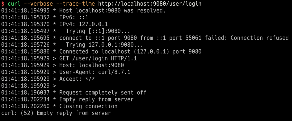curl コマンドで動作確認をしてみましょう。今後の結果と比較するため、 verbose オプションや trace-time オプションをつけてネットワークの様子を表示させておきます。